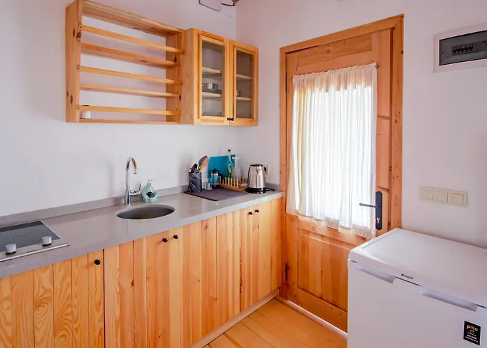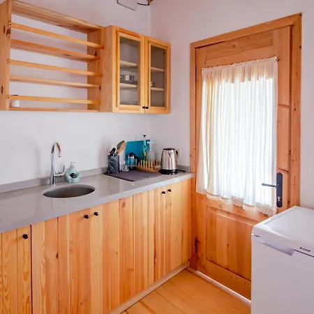 Kitchenette juntamente com refrigerador estão disponíveis nesta casa de férias de Datça.